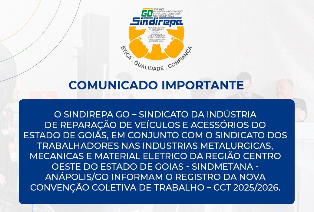 O Sindirepa GO – Sindicato da Indústria de Reparação de Veículos e Acessórios do Estado de Goiás, em conjunto com o SINDICATO DOS TRABALHADORES NAS INDUSTRIAS METALURGICAS, MECANICAS E MATERIAL ELETRICO DA REGIÃO CENTRO OESTE DO ESTADO DE GOIAS – SINDMETANA – ANÁPOLIS/GO, INFORMAM O REGISTRO DA NOVA CONVENÇÃO COLETIVA DE TRABALHO – CCT 2025/2026.